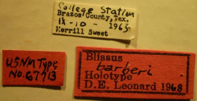 Blissus barberi - Holotype Labels (NMNH) - (CC BY-NC 3.0) - Photo by Pablo M. Dellapé with permission from the National Museum of Natural History (NMNH), Smithsonian Institution, Washington, D.C.