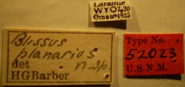 Blissus planarius - Holotype Labels (NMNH) - (CC BY-NC 3.0) - Photo by Pablo M. Dellapé with permission from the National Museum of Natural History (NMNH), Smithsonian Institution, Washington, D.C.