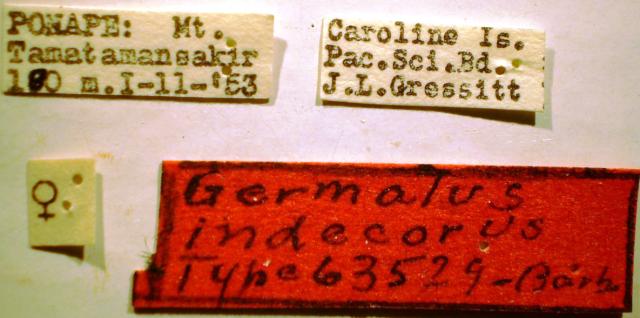 Germalus indecorus - Holotype Labels (NMNH) - (CC BY-NC 3.0) - Photo by Pablo M. Dellapé with permission from the National Museum of Natural History (NMNH), Smithsonian Institution, Washington, D.C.
