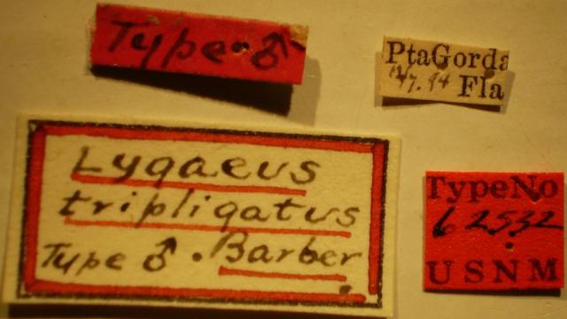 Lygaeus tripligatus - Holotype Labels(NMNH) - (CC BY-NC 3.0) - Photo by Pablo M. Dellapé with permission from the National Museum of Natural History (NMNH), Smithsonian Institution, Washington, D.C.