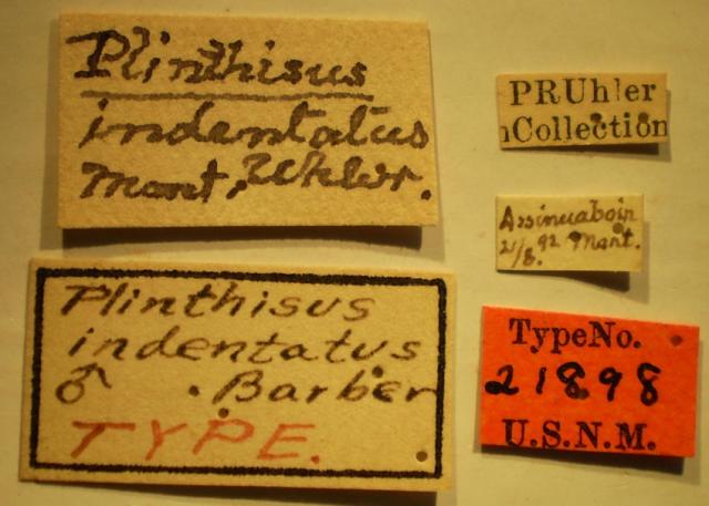 Plinthisus indentatus - Holotype Labels (NMNH) - (CC BY-NC 3.0) - Photo by Pablo M. Dellapé with permission from the National Museum of Natural History (NMNH), Smithsonian Institution, Washington, D.C.