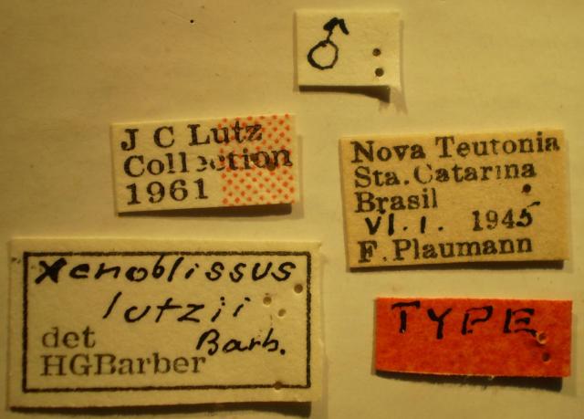 Xenoblissus lutzii - Holotype Labels (NMNH) - (CC BY-NC 3.0) - Photo by Pablo M. Dellapé with permission from the National Museum of Natural History (NMNH), Smithsonian Institution, Washington, D.C.
