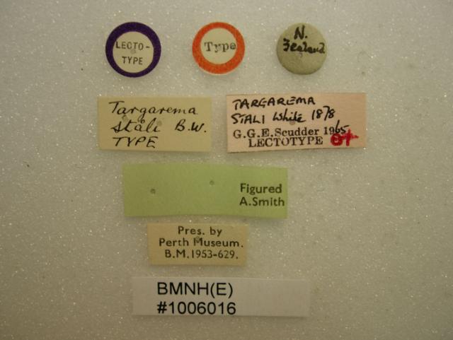 Targarema stali White,1878 Lectotype [labels] (CC BY-NC 3.0) Attribution: © The Natural History Museum. Photograph: Tristan Bantock