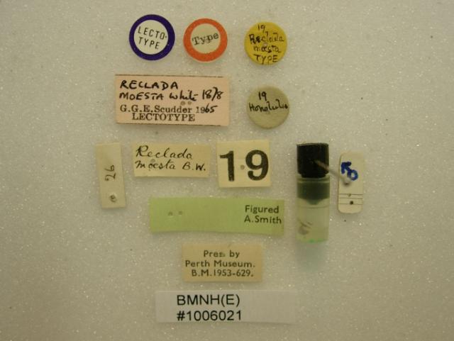 Reclada moesta White,1878 Lectotype [labels] (CC BY-NC 3.0) Attribution: © The Natural History Museum. Photograph: Tristan Bantock