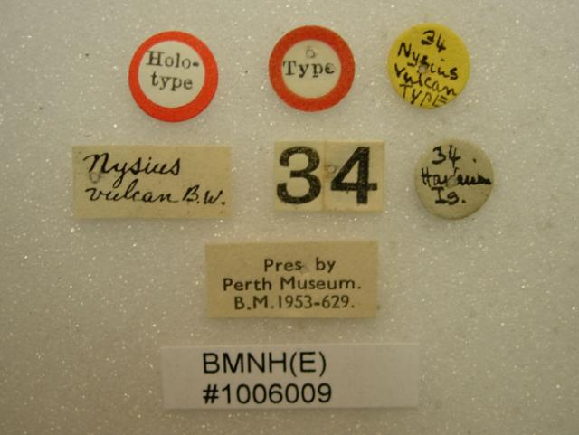 Nysius vulcan White,1878 Holotype [labels] (CC BY-NC 3.0) Attribution: © The Natural History Museum. Photograph: Tristan Bantock