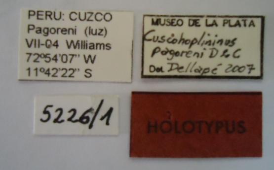 Cuscohoplininus pagoneri. Holotype. Labels. (MLP) - (CC BY-NC 4.0) - Photo by Eugenia Minghetti. Museo de La Plata. Facultad de Ciencias Naturales y Museo, La Plata, Argentina.