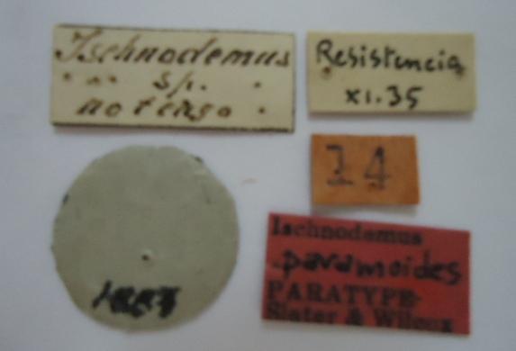 Ischnodemus paramoides. Paratype. Labels. (MLP) - (CC BY-NC 4.0) - Photo by Eugenia Minghetti. Museo de La Plata. Facultad de Ciencias Naturales y Museo, La Plata, Argentina.