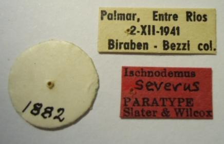 Ischnodemus severus. Paratype. Labels. (MLP) - (CC BY-NC 4.0) - Photo by Eugenia Minghetti. Museo de La Plata. Facultad de Ciencias Naturales y Museo, La Plata, Argentina.