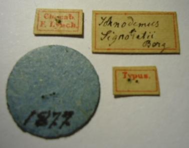 Ischnodemus signoretti. Holotype. Labels. (MLP) - (CC BY-NC 4.0) - Photo by Eugenia Minghetti. Museo de La Plata. Facultad de Ciencias Naturales y Museo, La Plata, Argentina.