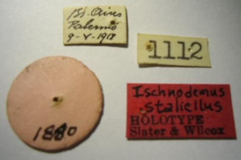Ischnodemus staliellus. Holotype. Labels. (MLP) - (CC BY-NC 4.0) - Photo by Eugenia Minghetti. Museo de La Plata. Facultad de Ciencias Naturales y Museo, La Plata, Argentina.