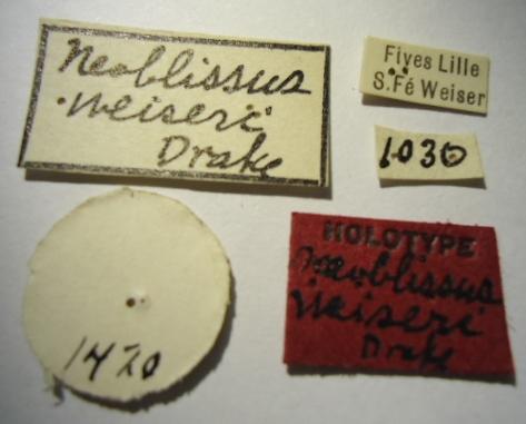 Neoblissus weiseri. Holotype. Labels. (MLP) - (CC BY-NC 4.0) - Photo by Eugenia Minghetti. Museo de La Plata. Facultad de Ciencias Naturales y Museo, La Plata, Argentina.