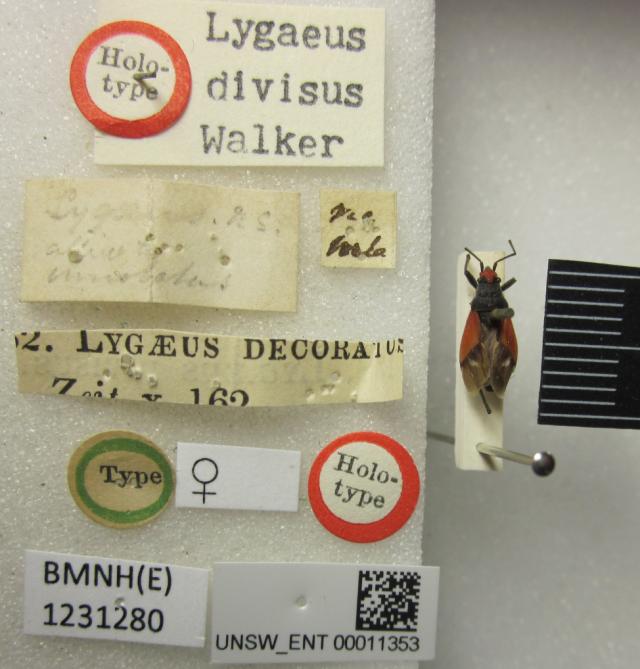 Lygaeus divisus. Holotype. (BMNH) - (CC BY-NC 4.0) Photo by Stuart Cole, reproduced with permission from the Natural History Museum, London, UK.