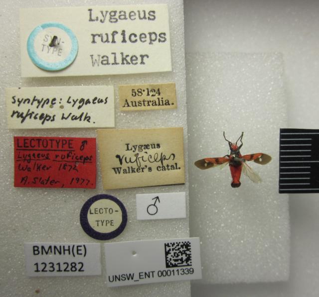 Lygaeus ruficeps. Lectotype. (BMNH) - (CC BY-NC 4.0) Photo by Stuart Cole, reproduced with permission from the Natural History Museum, London, UK.