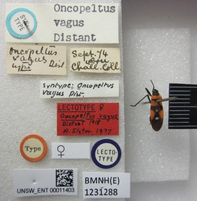 Oncopeltus vagus. Lectotype. (BMNH) - (CC BY-NC 4.0) Photo by Stuart Cole, reproduced with permission from the Natural History Museum, London, UK.