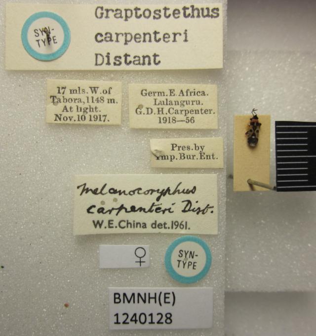 Graptostethus carpenteri. Syntype. (BMNH) - (CC BY-NC 4.0) Photo by Stuart Cole, reproduced with permission from the Natural History Museum, London, UK.
