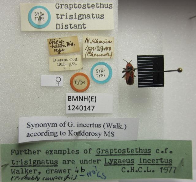 Graptostethus trisignatus. Syntype. (BMNH) - (CC BY-NC 4.0) Photo by Stuart Cole, reproduced with permission from the Natural History Museum, London, UK.