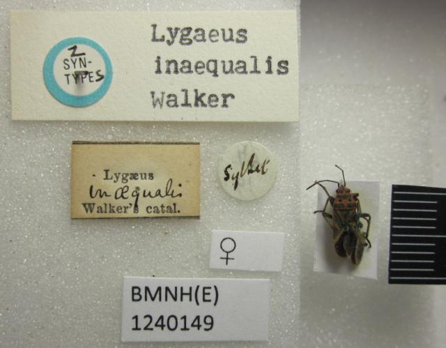 Lygaeus inaequalis. Syntype. (BMNH) - (CC BY-NC 4.0) Photo by Stuart Cole, reproduced with permission from the Natural History Museum, London, UK.