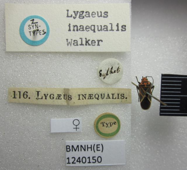 Lygaeus inaqualis. Syntype. (BMNH) - (CC BY-NC 4.0) Photo by Stuart Cole, reproduced with permission from the Natural History Museum, London, UK.