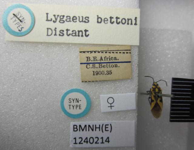 Lygaeus bettoni. Syntype. (BMNH) - (CC BY-NC 4.0) Photo by Stuart Cole, reproduced with permission from the Natural History Museum, London, UK.