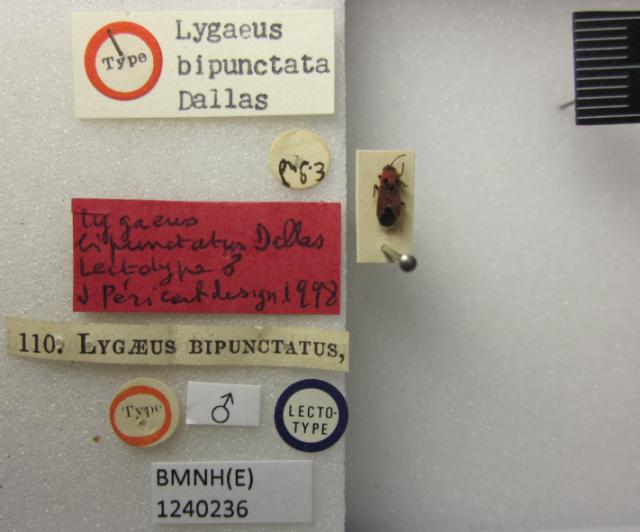 Lygaeus bipunctata. Lectotype. (BMNH) - (CC BY-NC 4.0) Photo by Stuart Cole, reproduced with permission from the Natural History Museum, London, UK.