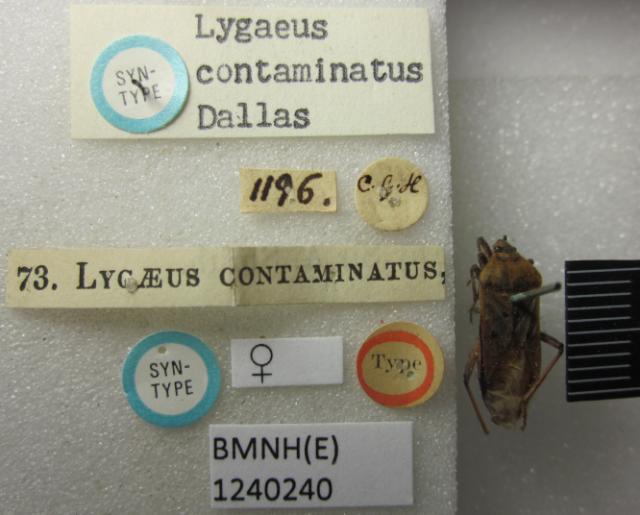 Lygaeus contaminatus. Syntype. (BMNH) - (CC BY-NC 4.0) Photo by Stuart Cole, reproduced with permission from the Natural History Museum, London, UK.
