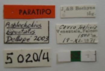 Ashlockobius bipuntatus. Paratype Labels. (MLP) - (CC BY-NC 4.0) - Photo by Eugenia Minghetti, reproduced with permission from the Museo de La Plata, La Plata, Argentina.