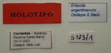 Erlacda argentinensis. Holotype Lables. (MLP) - (CC BY-NC 4.0) - Photo by Eugenia Minghetti, reproduced with permission from the Museo de La Plata, La Plata, Argentina.