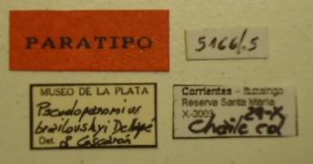 Pseudoparomius brailovskyi. Paratype Labels. (MLP) - (CC BY-NC 4.0) - Photo by Eugenia Minghetti, reproduced with permission from the Museo de La Plata, La Plata, Argentina.