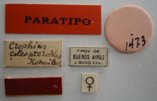 Crophius coleopteroides. Paratype Labels. (MLP) - (CC BY-NC 4.0) - Photo by Eugenia Minghetti, reproduced with permission from the Museo de La Plata, La Plata, Argentina.