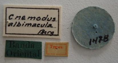 Cnemodus albimacula. Type Labels. (MLP) - (CC BY-NC 4.0) - Photo by Eugenia Minghetti, reproduced with permission from the Museo de La Plata, La Plata, Argentina.