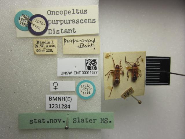 Oncopeltus purpurascens. Paralectotype. (BMNH) - (CC BY-NC 4.0) Photo by Stuart Cole, reproduced with permission from the Natural History Museum, London, UK.