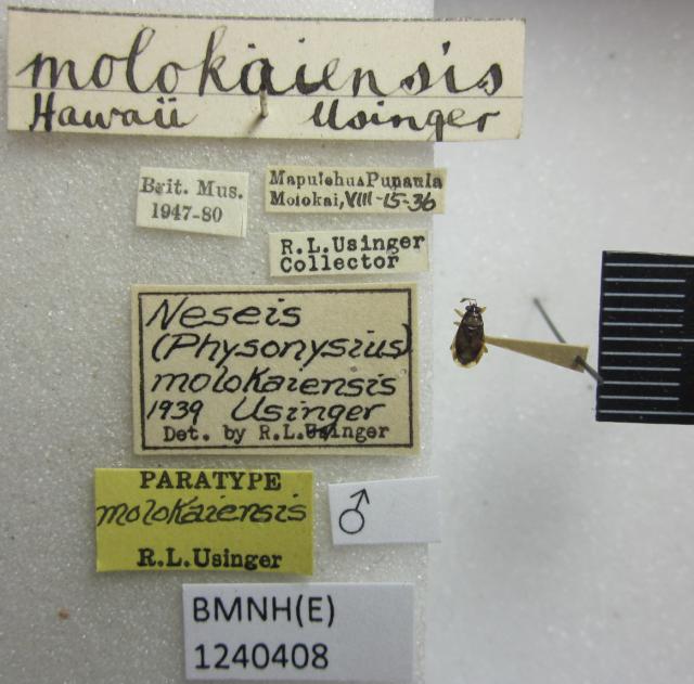 Neseis (Physonysius) molokaiensis. Paratype. (BMNH) - (CC BY-NC 4.0) Photo by Stuart Cole, reproduced with permission from the Natural History Museum, London, UK.