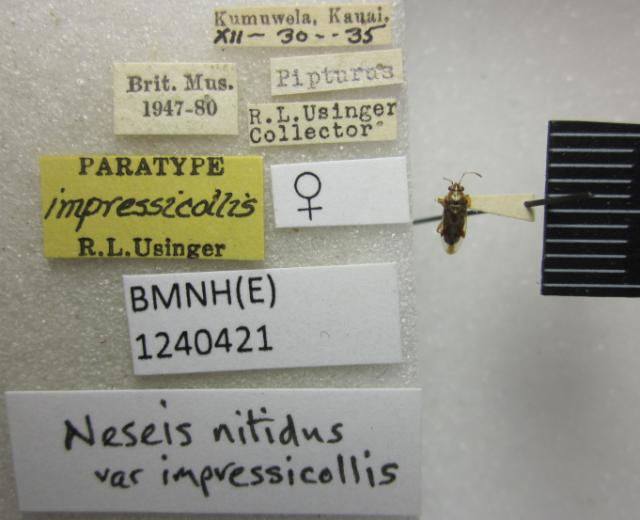 Neseis nitidus impressicollis. Paratype. (BMNH) - (CC BY-NC 4.0) Photo by Stuart Cole, reproduced with permission from the Natural History Museum, London, UK.