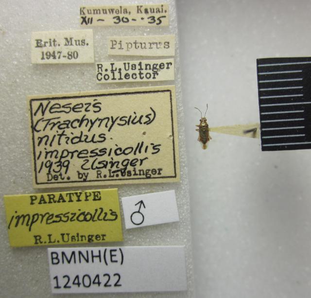 Neseis nitidus impressicollis. Paratype. (BMNH) - (CC BY-NC 4.0) Photo by Stuart Cole, reproduced with permission from the Natural History Museum, London, UK.
