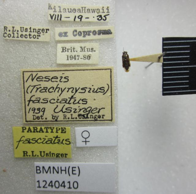 Neseis (Trachynysius) fasciatus. Paratype. (BMNH) - (CC BY-NC 4.0) Photo by Stuart Cole, reproduced with permission from the Natural History Museum, London, UK.