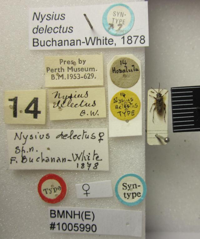 Nysius delectus. Syntype. (BMNH) - (CC BY-NC 4.0) Photo by Stuart Cole, reproduced with permission from the Natural History Museum, London, UK.