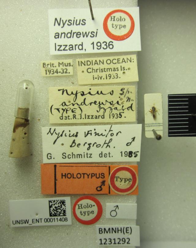 Nysius andrewsi. Holotype. (BMNH) - (CC BY-NC 4.0) Photo by Stuart Cole, reproduced with permission from the Natural History Museum, London, UK.