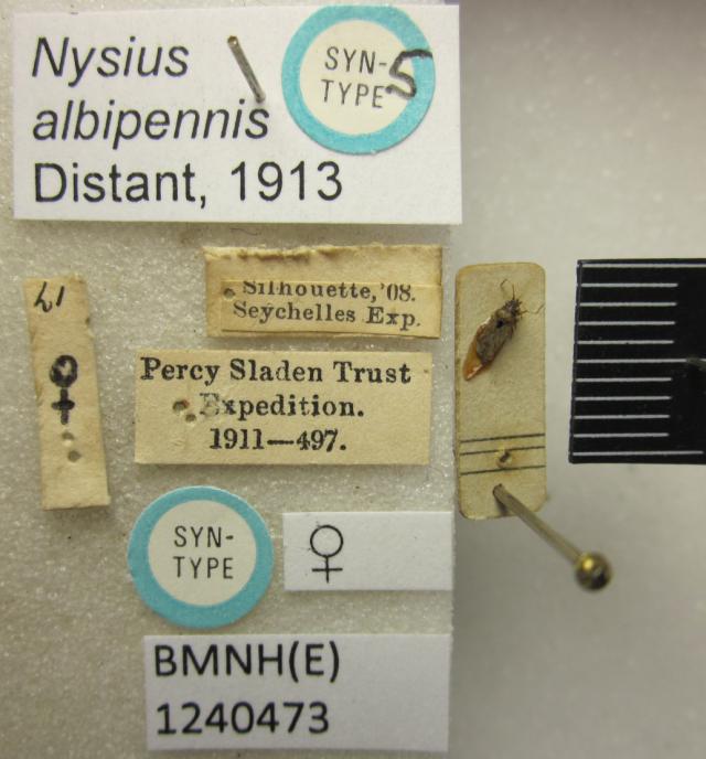 Nysius albipennis. Syntype. (BMNH) - (CC BY-NC 4.0) Photo by Stuart Cole, reproduced with permission from the Natural History Museum, London, UK.