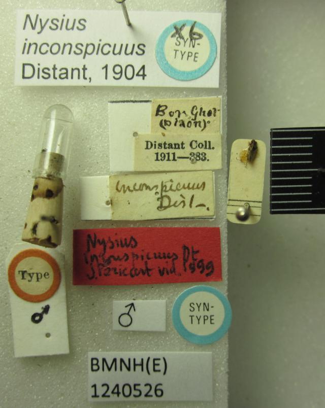 Nysius inconspicuus. Lectotype. (BMNH) - (CC BY-NC 4.0) Photo by Stuart Cole, reproduced with permission from the Natural History Museum, London, UK.
