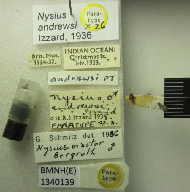 Nysius andrewsi. Paratype. (BMNH) - (CC BY-NC 4.0) Photo by Stuart Cole, reproduced with permission from the Natural History Museum, London, UK.