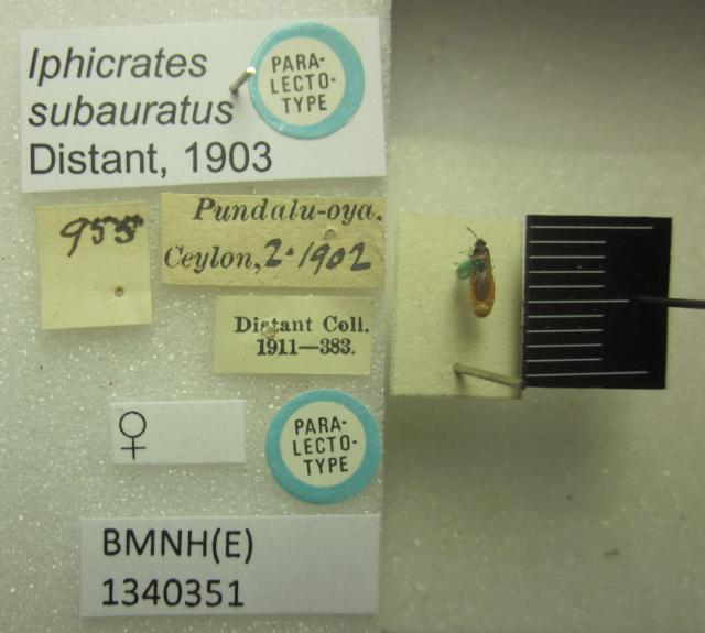Iphicrates subauratus. Paralectotype. (BMNH) - (CC BY-NC 4.0) Photo by Stuart Cole, reproduced with permission from the Natural History Museum, London, UK.