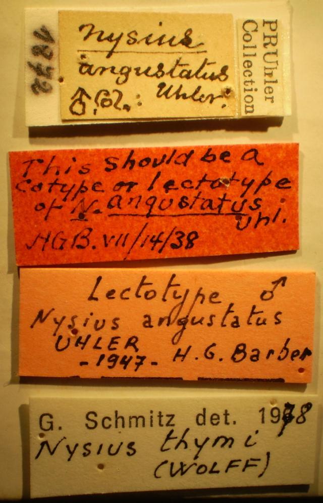 Nysius angustatus LECTOTYPE Labels (NMNH) - (CC BY-NC 4.0) - Photo by Pablo M. Dellapé with permission from the National Museum of Natural History (NMNH), Smithsonian Institution, Washington, D.C.