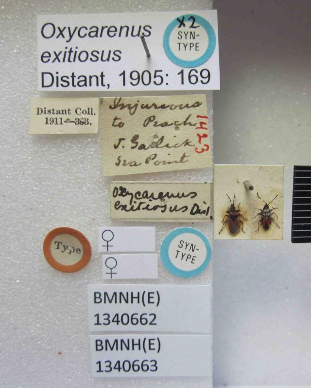 Oxycarenus exitiosus. Syntype. (BMNH) - (CC BY-NC 4.0) Photo by Stuart Cole, reproduced with permission from the Natural History Museum, London, UK.