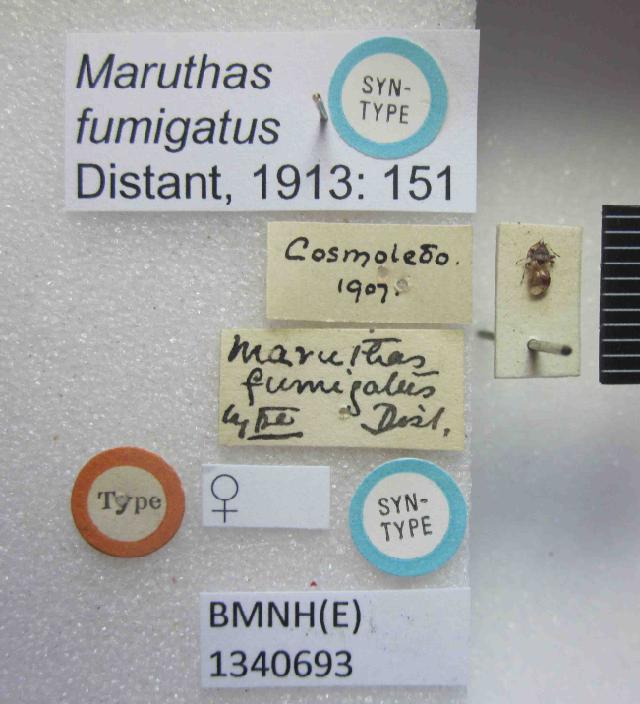Maruthas fumigatus. Syntype. (BMNH) - (CC BY-NC 4.0) Photo by Stuart Cole, reproduced with permission from the Natural History Museum, London, UK.