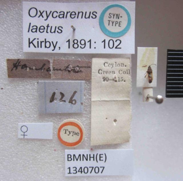 Oxycarenus laetus. Syntype. (BMNH) - (CC BY-NC 4.0) Photo by Stuart Cole, reproduced with permission from the Natural History Museum, London, UK.