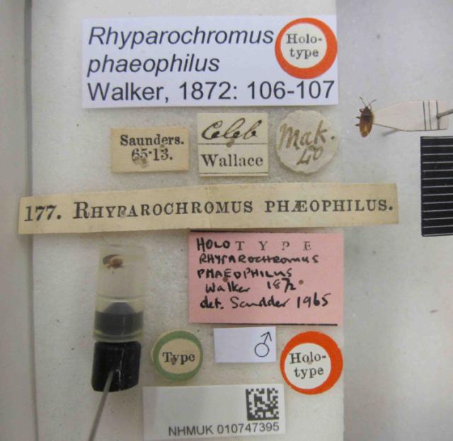 Rhyparochromus phaeophilus. Holotype. (BMNH) - (CC BY-NC 4.0) Photo by Stuart Cole, reproduced with permission from the Natural History Museum, London, UK.