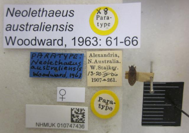 Neolethaeus australiensis. Paratype. (BMNH) - (CC BY-NC 4.0) Photo by Stuart Cole, reproduced with permission from the Natural History Museum, London, UK.