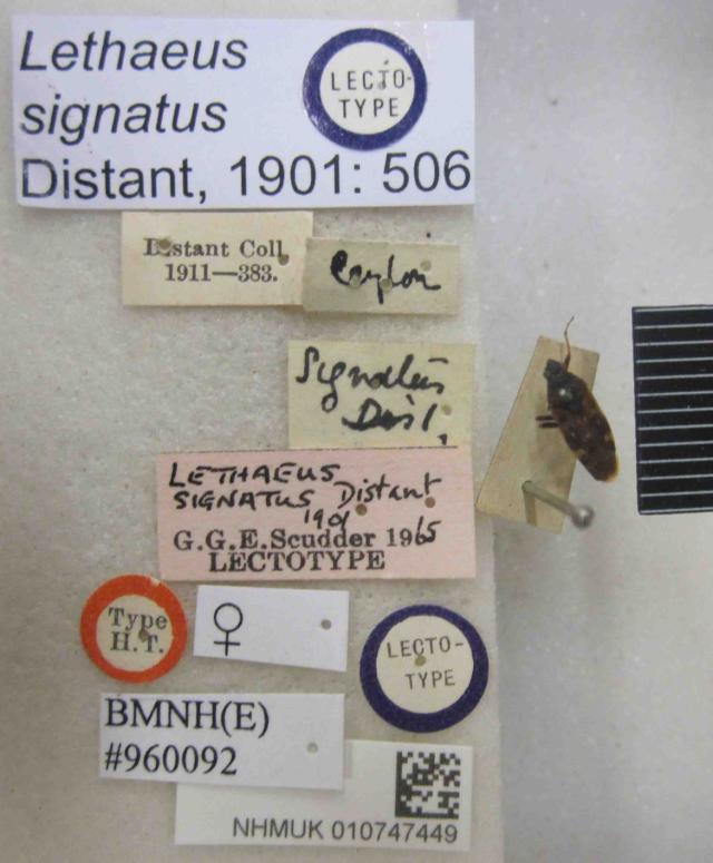 Lethaeus signatus. Lectotype. (BMNH) - (CC BY-NC 4.0) Photo by Stuart Cole, reproduced with permission from the Natural History Museum, London, UK.