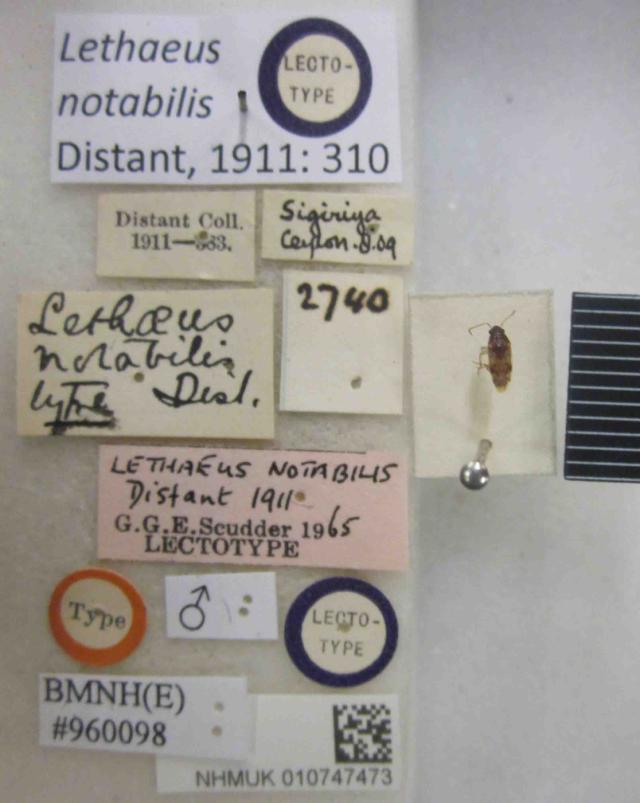 Lethaeus notabilis. Lectotype. (BMNH) - (CC BY-NC 4.0) Photo by Stuart Cole, reproduced with permission from the Natural History Museum, London, UK.