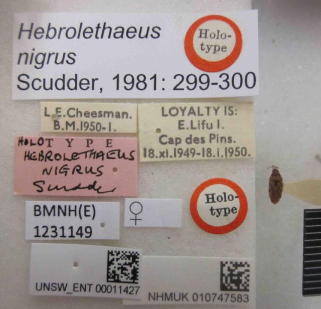 Hebrolethaeus nigrus. Holotype. (BMNH) - (CC BY-NC 4.0) Photo by Stuart Cole, reproduced with permission from the Natural History Museum, London, UK.